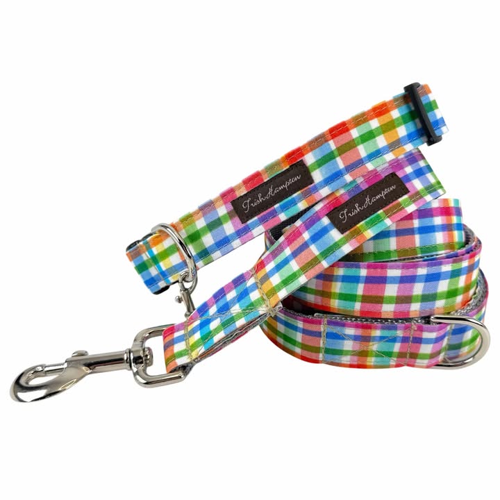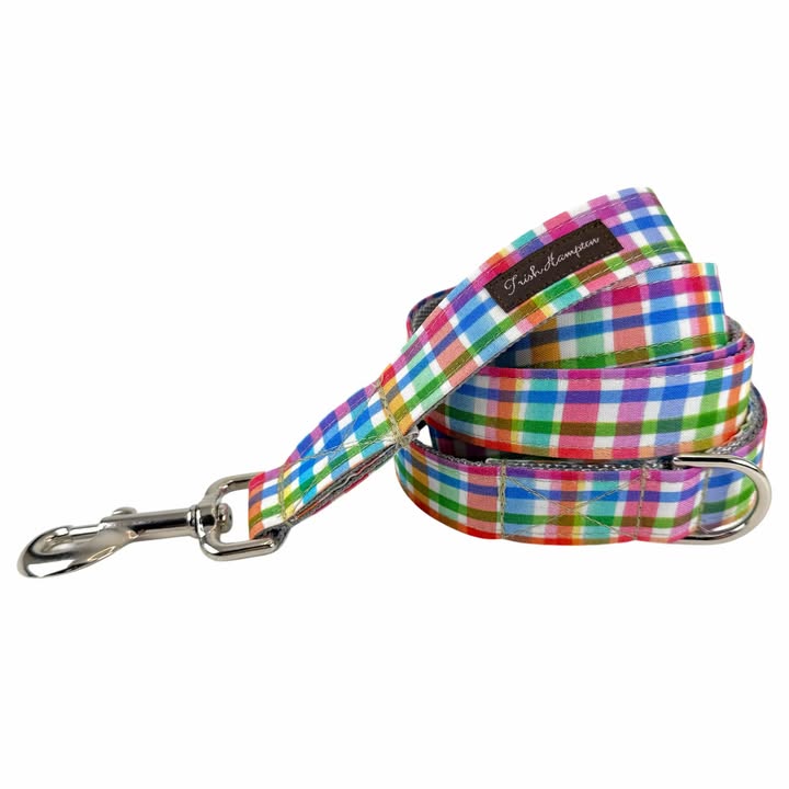 Our Rainbow gingham fabric leashes are made by using beautiful fabrics lined with fusible interfacing sewn to durable nylon webbing. Fastened with a stainless steel snaphook. Machine washable. You won't find a more durable yet fashionable leash for your pooch.