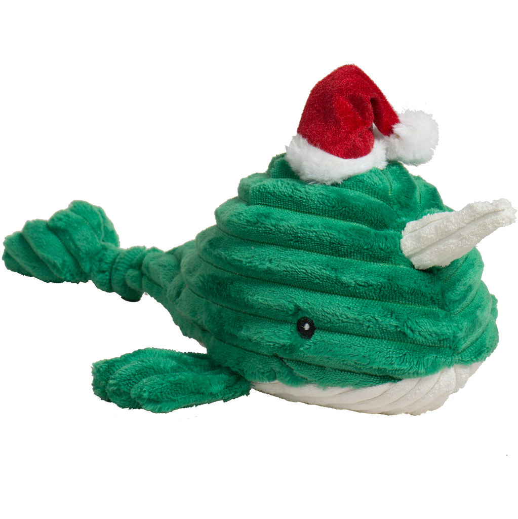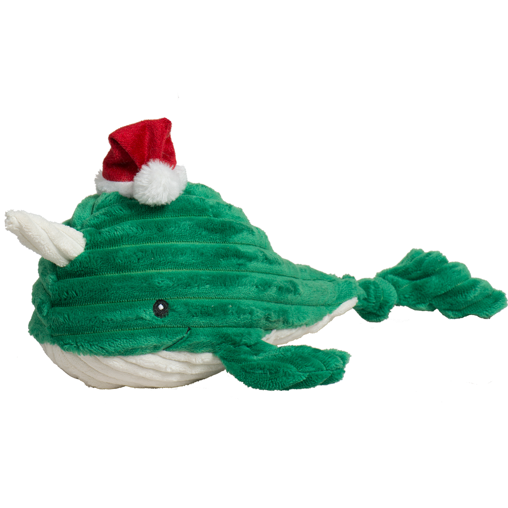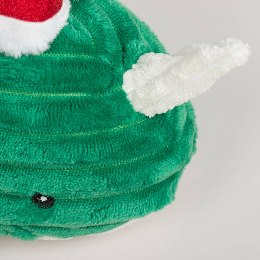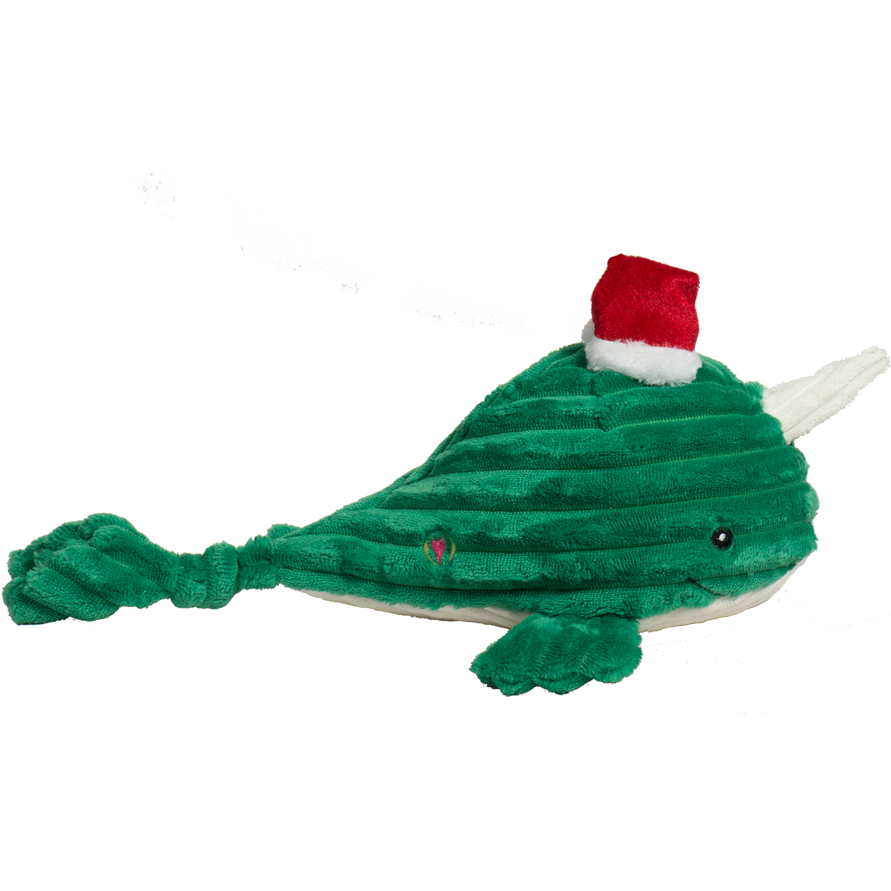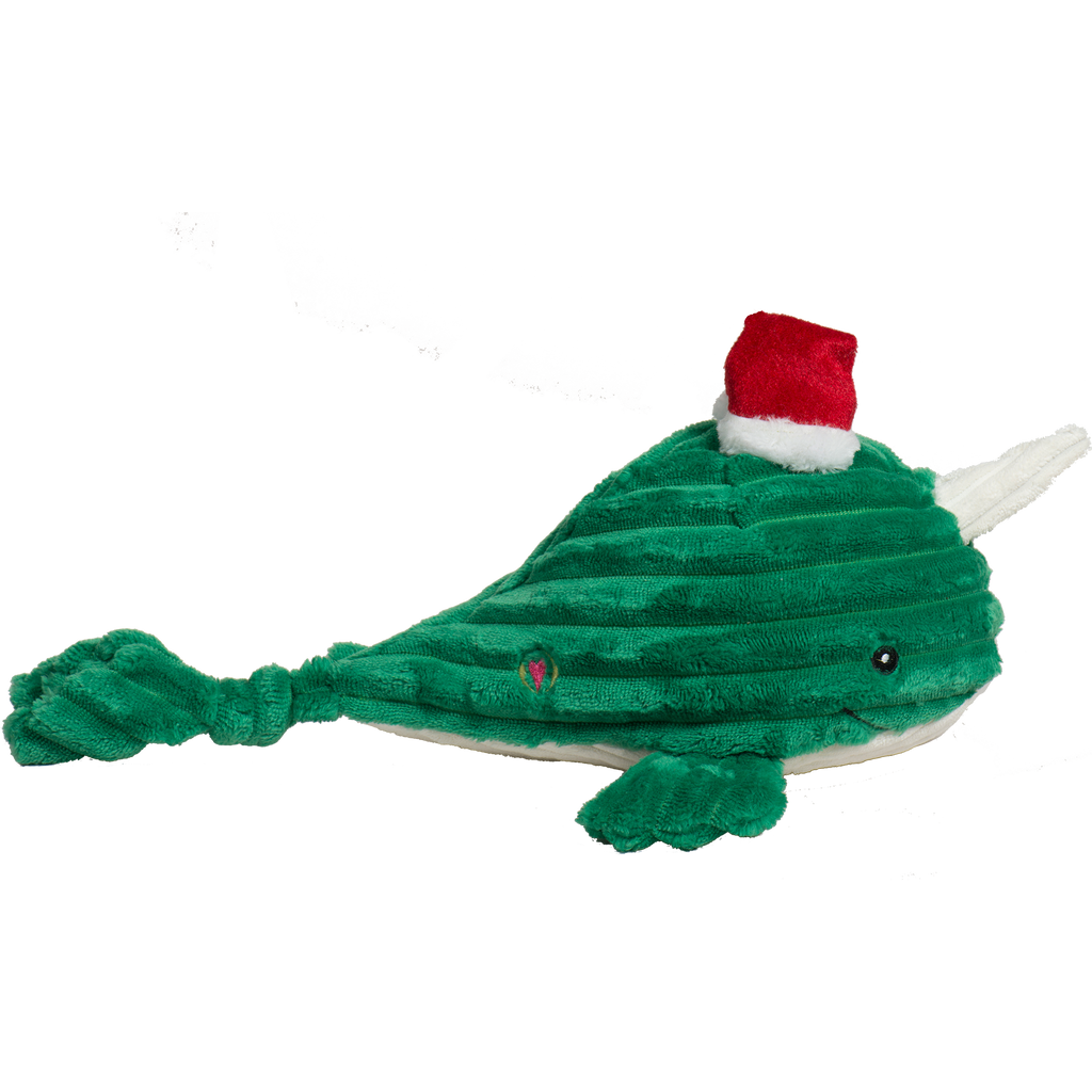 Noe Narwhal Knottie®–The Ultimate Holiday Toy to Bring festive charm! Featuring luxurious green corduroy, a red Santa cap, and a white corduroy belly, Noe Narwhal combines classic holiday spirit with a playful twist. Its long, floppy knotted limbs add extra fun during playtime. Key Features: Luxurious Plush: Extra-wide wale green corduroy, deep red faux-fur Santa hat, and soft white belly for a festive look. Durable Construction: Tuffut Technology®—a 2-layer lining for extra durability. Interactive Fun: Includes 2 squeakers—1 in the body and 1 in the tail—keeping dogs engaged. Perfect for Play: Long knotted limbs add play value for tugging and fetching. Dimensions: Small: 6.5" x 9" x 5", 0.13 lbs Large: 10" x 13" x 8"