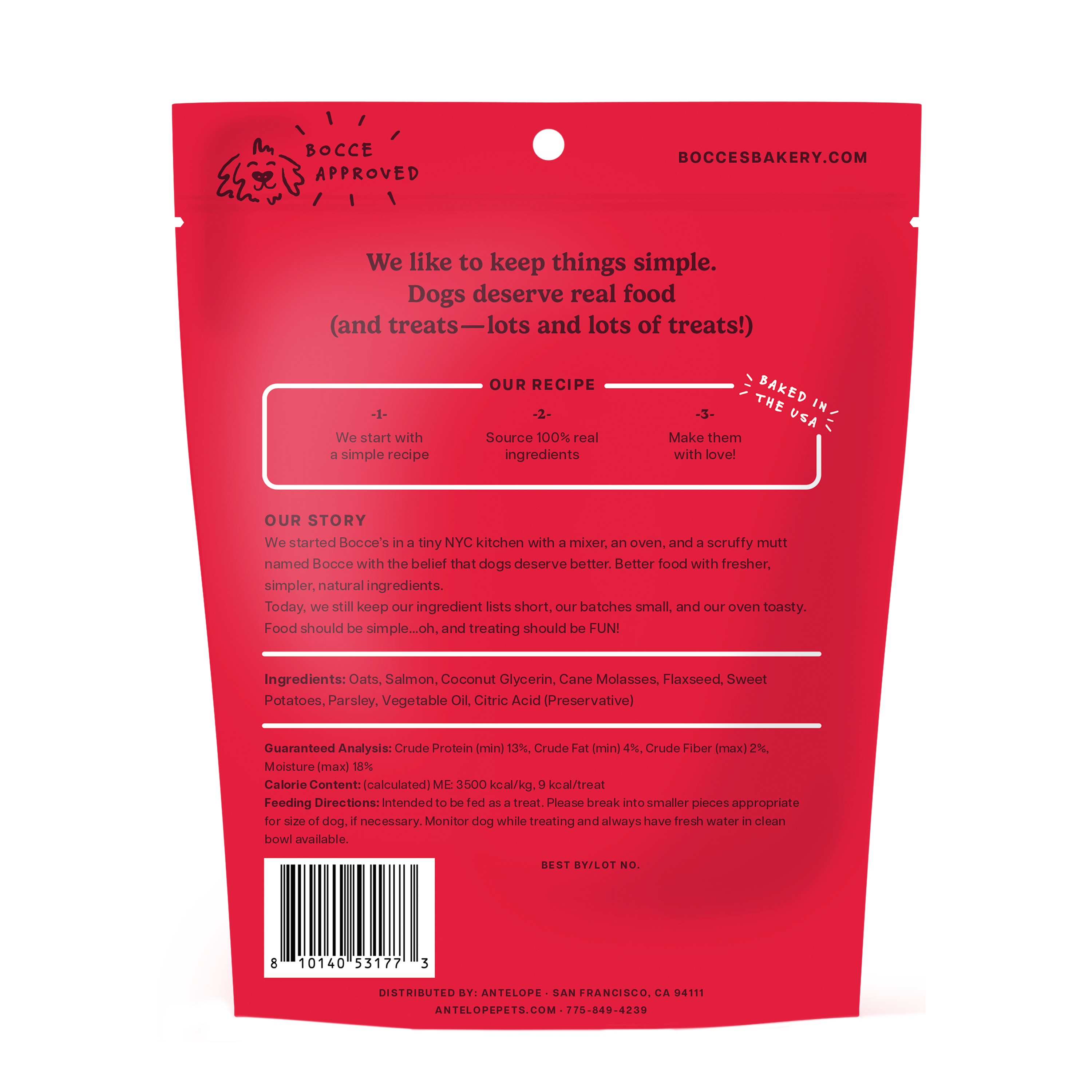 Ingredients: Oats, Salmon, Coconut Glycerin, Cane Molasses, Flaxseed, Sweet Potatoes, Parsley, Vegetable Oil, Citric Acid (Preservative)