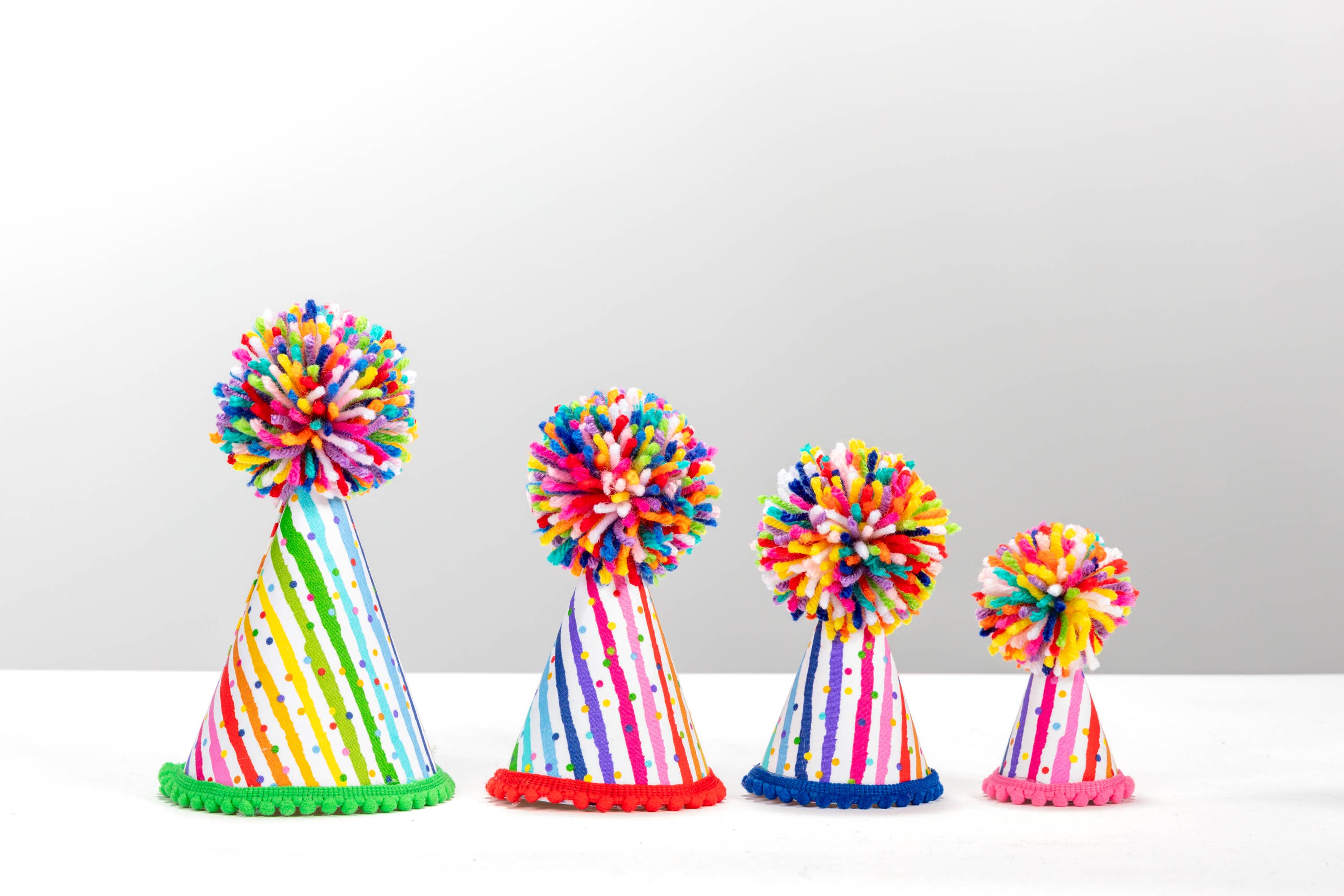 Each hat has an elastic band to keep the hat on. Our hats are handcrafted, trim and pom may vary. All hats include UPC barcoding. * X-Small hats are approx. 3" tall and 2" wide at the base. * Small hats are approx. 4" tall and 3" wide at the base. * Medium hats are approx. 5 1/2" tall and 3 1/2" wide at the base. * Large hats are approx. 6 1/2" tall and 4 1/2" wide at the base.