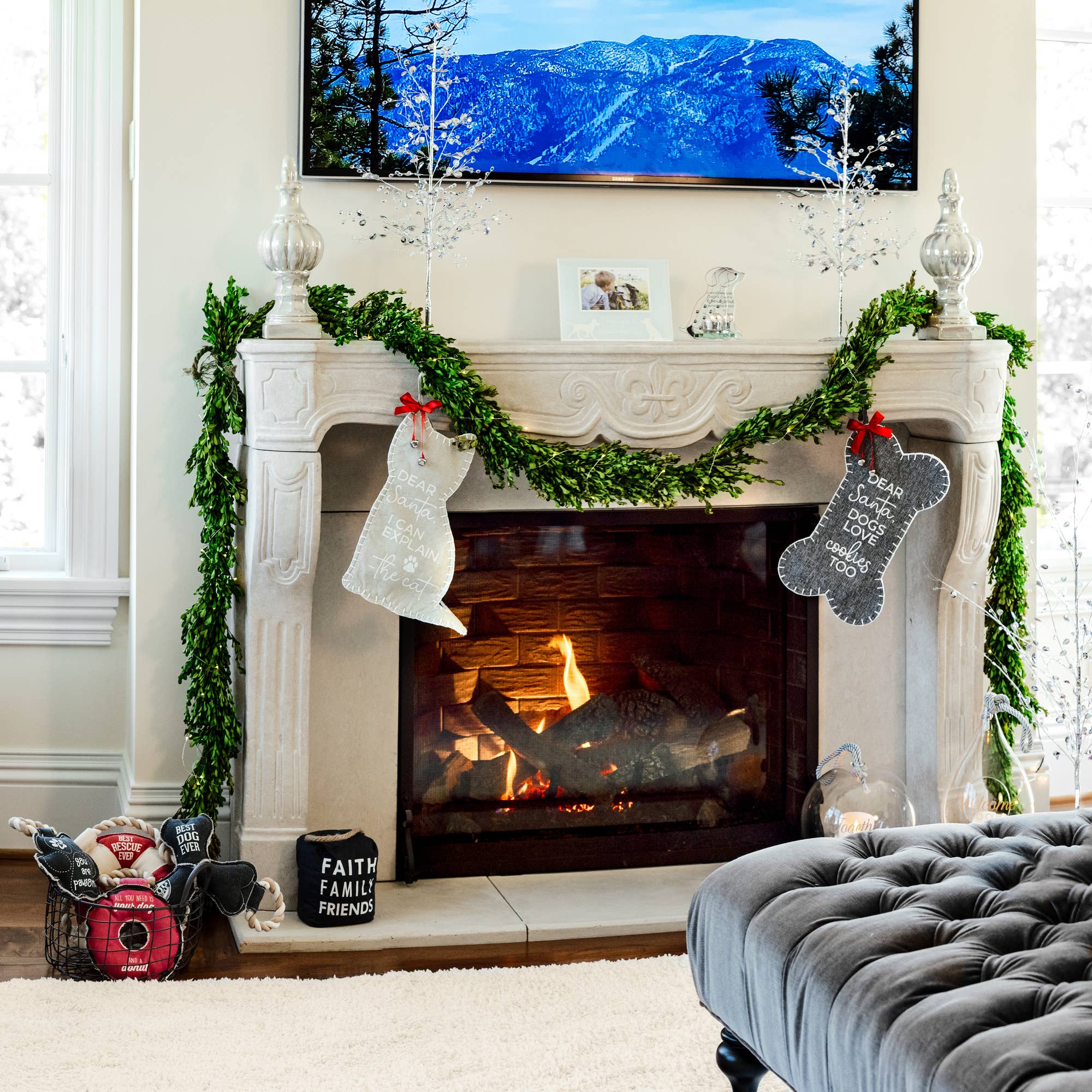 This 15" stocking with white whip stitching is sewn into the shape of a dog bone from a gray textured canvas tweed 100% polyester material. The interior lining is white and made from 100% cotton. The red bowtied ribbon and silver metal bells are attached to the top left where the hangable loop is. This heavy-duty, durable stocking can hold up to 5.5 lbs. A mini 4.5" dog bone-shaped bone ornament is also included with a loop for hanging. "Dear Santa, Dogs Love Cookies Too" white sentiment-printed decal is applied to the front of the stocking. The sewn-in cream fabric tag on the ornament states, "I Love My Fur Baby," printed in gray. Spot clean with soap and warm water, as needed. The set is packaged in a polybag with a hang tag. Remove all packaging before interacting with your pet.