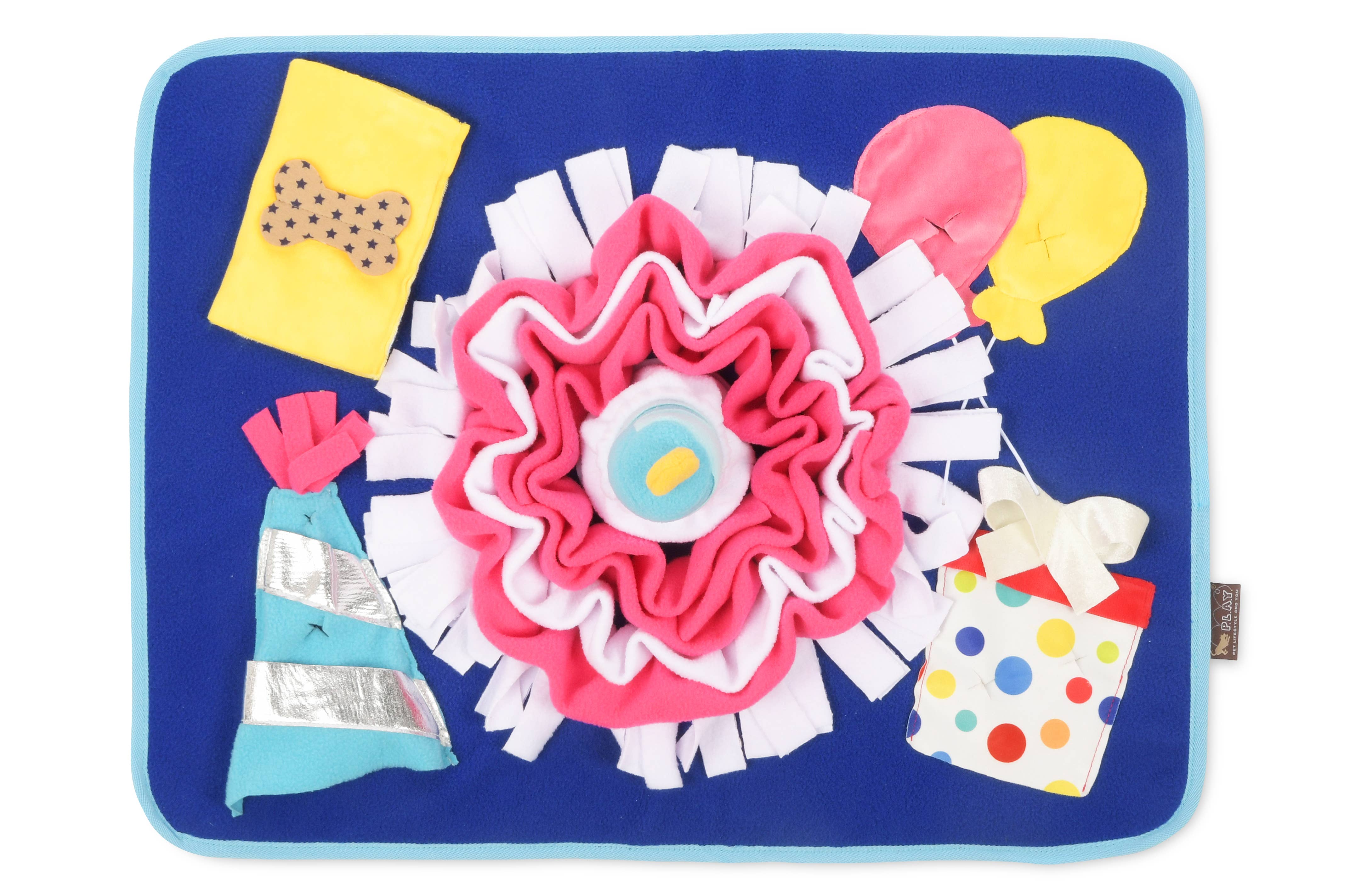 Make every day a celebration with P.L.A.Y.'s Woof-day Celebration Snuffle Mat! This colorful and tail-wagging sensation is designed to add a touch of excitement and interactive enrichment to your pet's daily routine. Your pup will dive into a world of sniff-tastic adventure with hidden treats, engaging challenges and a squeaking candle. ○ Keeps your furiend mentally and physically stimulated and can also be used as a slow feeder for your pet ○ Provides a mixture of fabrics and textures to help alleviate boredom ○ Detachable candle with squeaker offers a fun extra toy for playtime ○ Lightweight/portable and easy storage ○ Machine washable and dryer friendly ○ Features AZO-free dyes ○