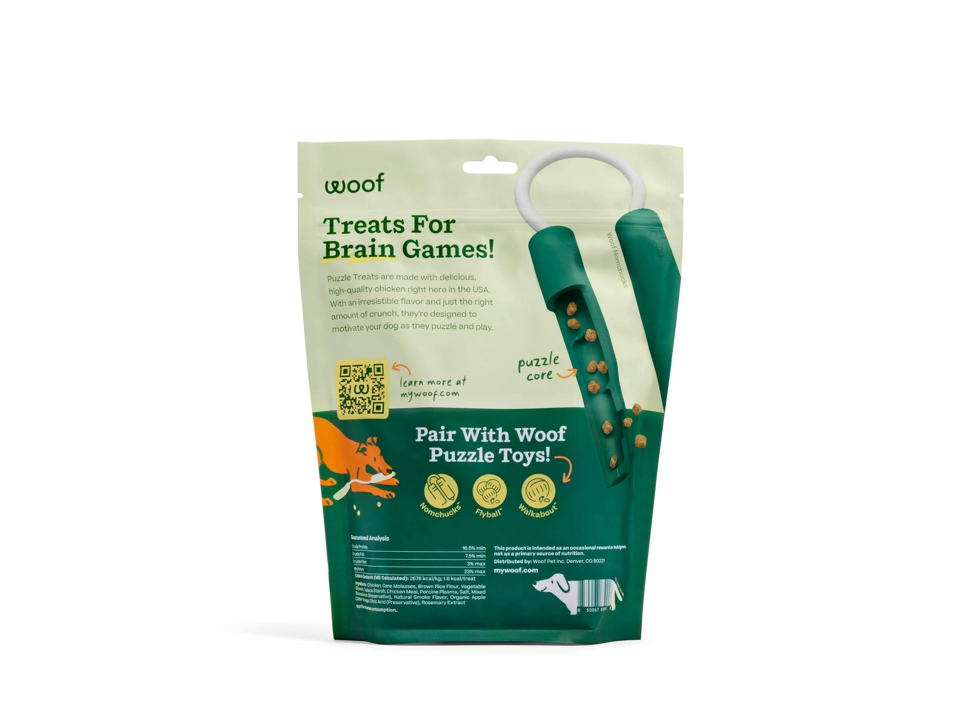 Meet the treat made for longer play. Perfectly sized for Woof puzzle toys, Puzzle Treats turn everyday fun into a tasty, brain-boosting challenge. Crafted with real chicken and brown rice, these protein-rich rewards are air-dried to lock in drool-worthy flavor (and irresistible aroma). Designed to fit Nomchucks, Walkabout, Flyball, and other puzzle or treat dispensing toys.